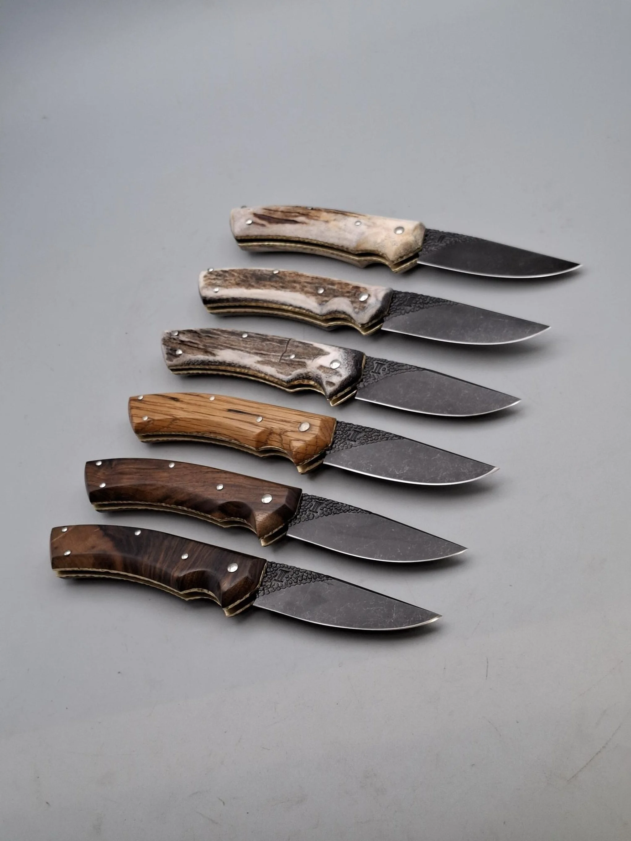 The signature series Gemini favourites! Scottish stag antler handles, textured and polished brass bolsters and pommels, brass pins and 1075Cr high carbon steel blades