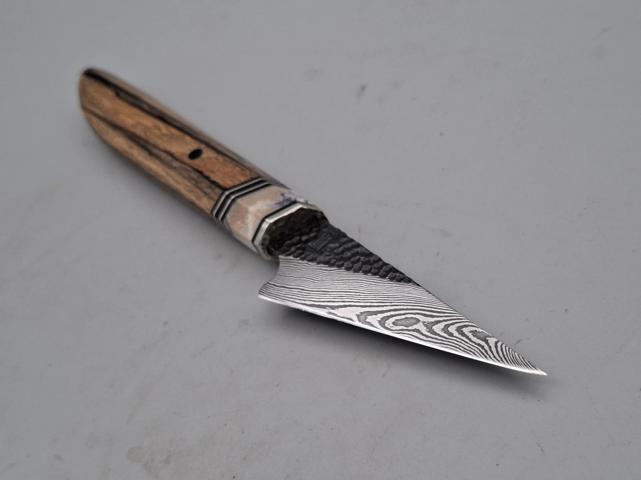 Japanese style petty knife with Stabilised Russian Birch burl handle with laminated brass and artificial blue pearl spacers