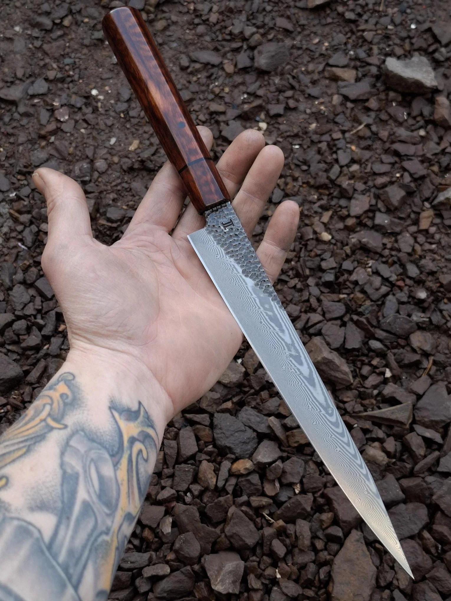 This 9 inch Gyuto chefs knife has a subtle patina on the blade mixed with a semi brushed finish, giving it an aged look. The handle is a WA style Bocote body with Dyed burr wood bolster, brass spacer and pins