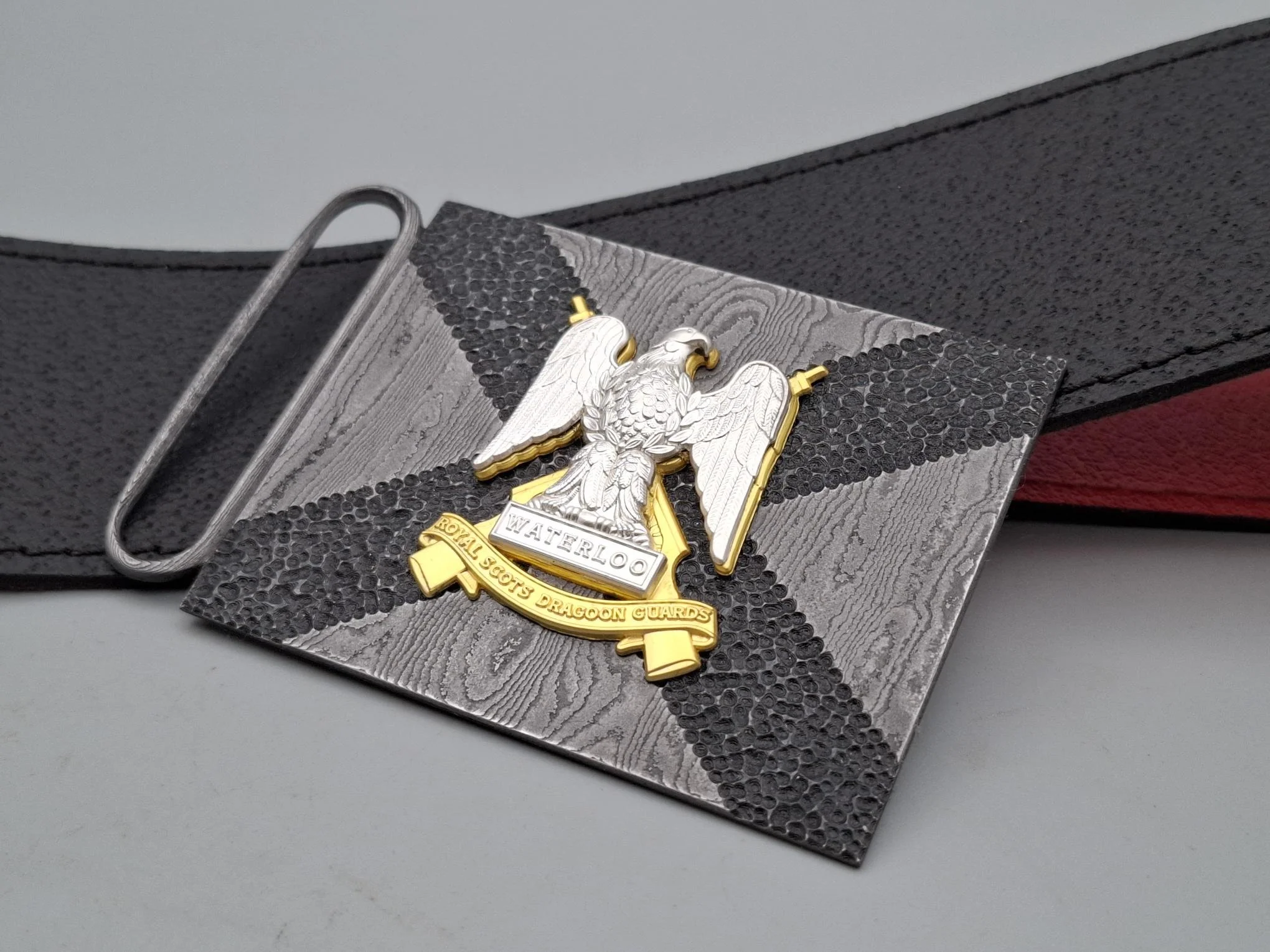 With its forge welded 1095 & 15N20 Damascus steel blade, aviation grade aluminium bolster and pommel, alumiunium inlays and deep red leather sheath - this sgian dubh is a subtle, yet stunning addition to any kilt