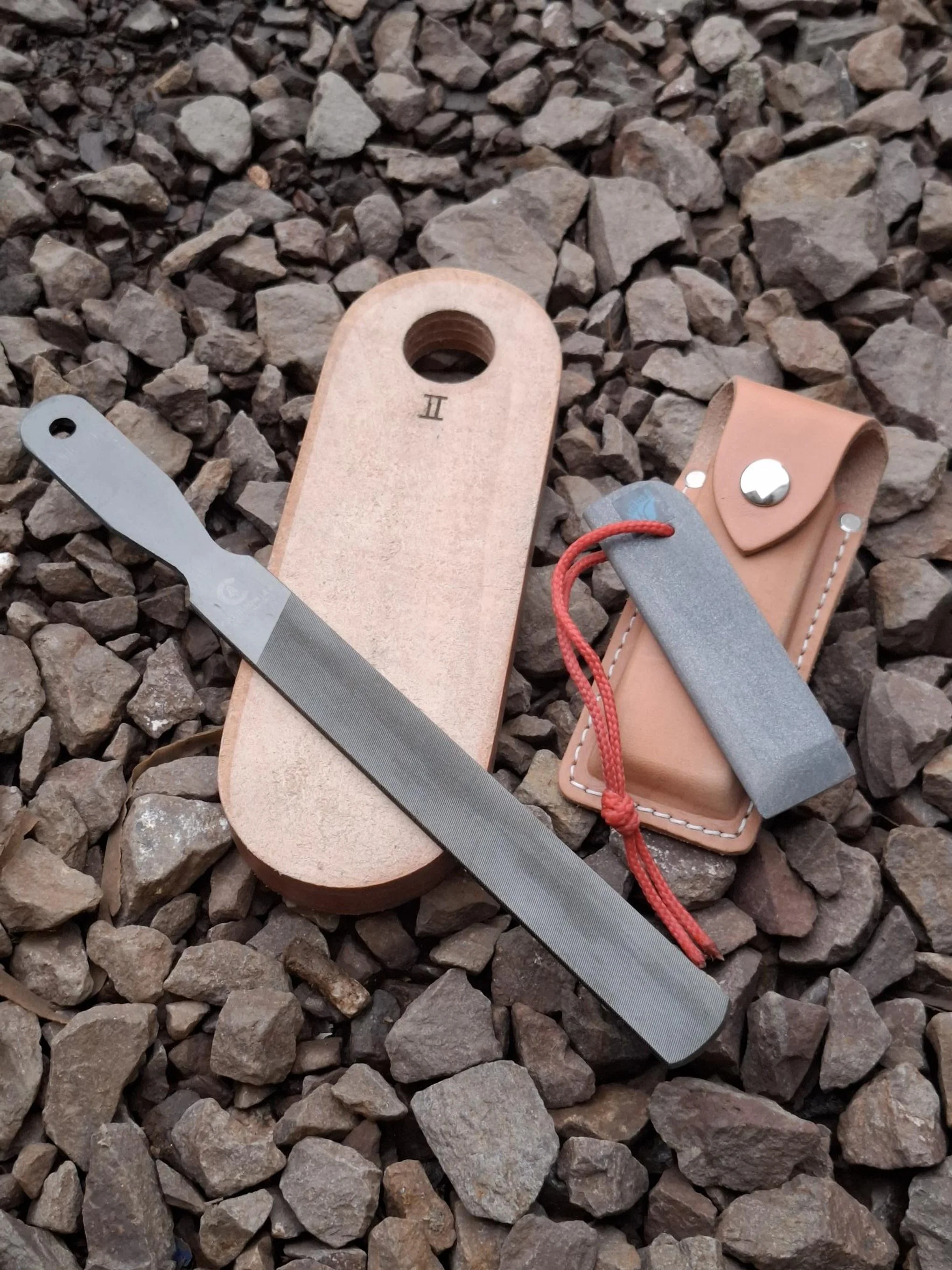 Compromising 1x axe file, great for getting chips and chunks filed out of your beloved axe. 1x leather honing strop and 1x sharpening stone complete with its own leather pouch.